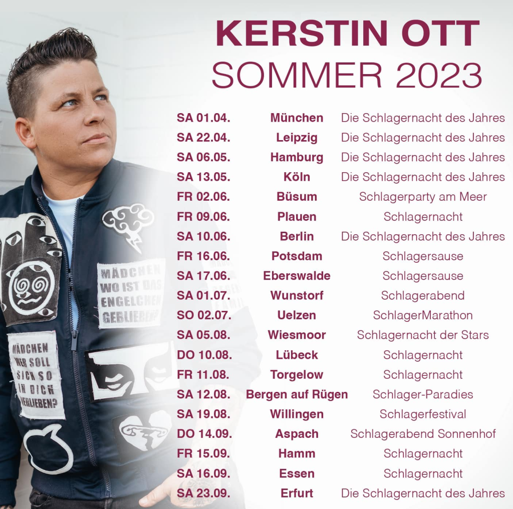 Neben ihrem Auftakt-Konzert in München spielt die Musikerin unter anderem in Hamburg, Köln und Lübeck bei Veranstaltungen wie beispielsweise „Schlagernacht des Jahres“, „SchlagerMarathon“ oder „Schlagersause“. Der letzte Auftritt soll aktuell am 23. September 2023 in Essen bei der „Schlagernacht“ stattfinden.