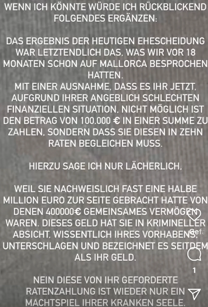 Doch der Vorwurf geht noch weiter. Peter wirft Iris vor, fast eine halbe Million Euro gespart zu haben, von denen 400.000 Euro gemeinsames Vermögen waren. Diese Summe habe sie “kriminell unterschlagen und als ihr eigenes Geld bezeichnet.”