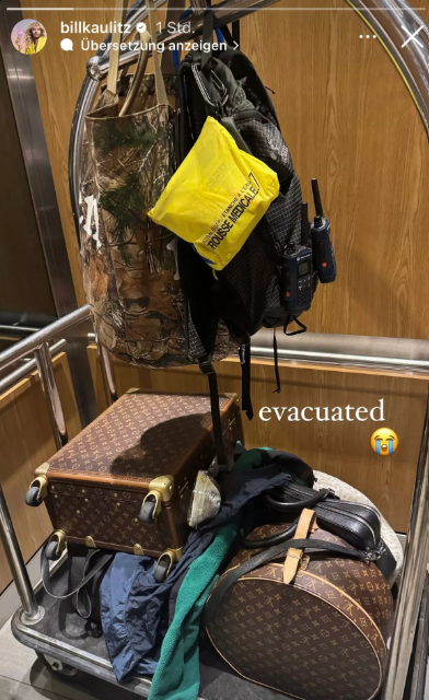 Auf einem Kofferwagen sind seine Habseligkeiten, darunter ein Koffer und eine Louis Vuitton-Tasche, zu sehen. Besonders auffällig ist ein Notfallset des Roten Kreuzes und zwei Walkie-Talkies, die er mitgenommen hat. Es scheint, als hätte der Musiker bereits Zuflucht in einem Hotel gefunden.