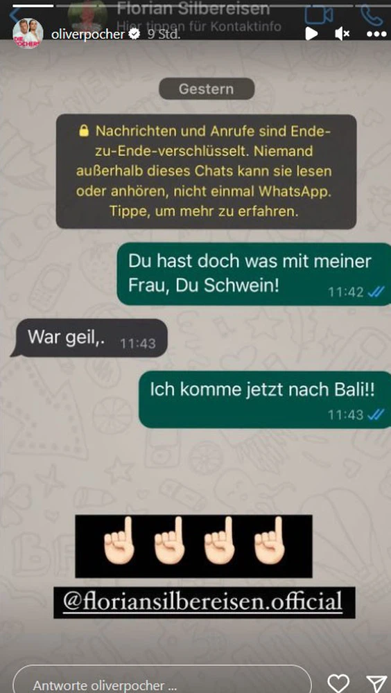 Die Gerüchte um die vorab kursierende „Traumschiff“-Liebesgeschichte griff Oliver Pocher in seinem Instagram-Account auf. Dort sendete er in seiner Story einen lustigen Chat-Verlauf mit Florian Silbereisen: „Du hast doch was mit meiner Frau, du Schwein“, schrieb Pocher spielerisch erzürnt, worauf Silbereisen antwortete: „War geil!“. „Ich komme jetzt nach Bali“, so der Comedian. Silbereisens Account wurde von dem 45-Jährigen auch direkt verlinkt. Tatsächlich meldeten sich die Pochers erst kürzlich via Instagram aus Bali – ob an den Gerüchten also tatsächlich etwas dran ist?
