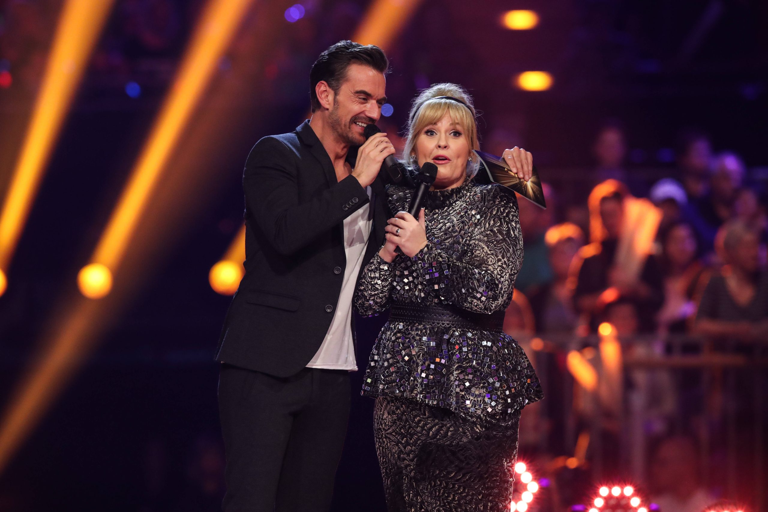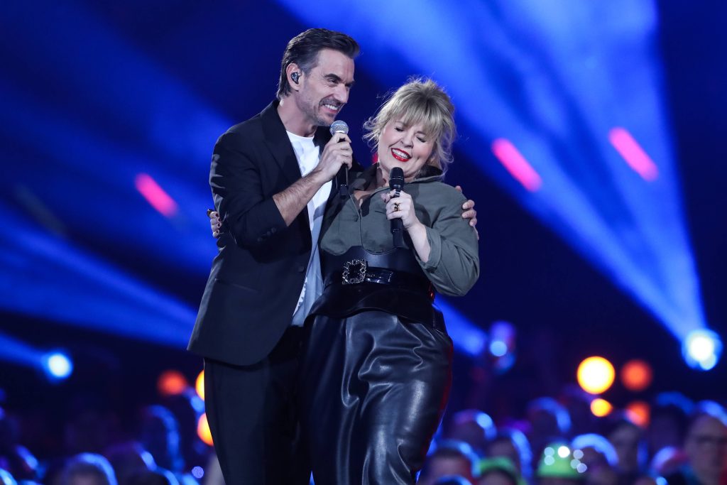 Moderator Florian Silbereisen (GER) mit Saengerin Maite Kelly – ARD Live Show ãSchlagerchampions – Das große Fest der Be